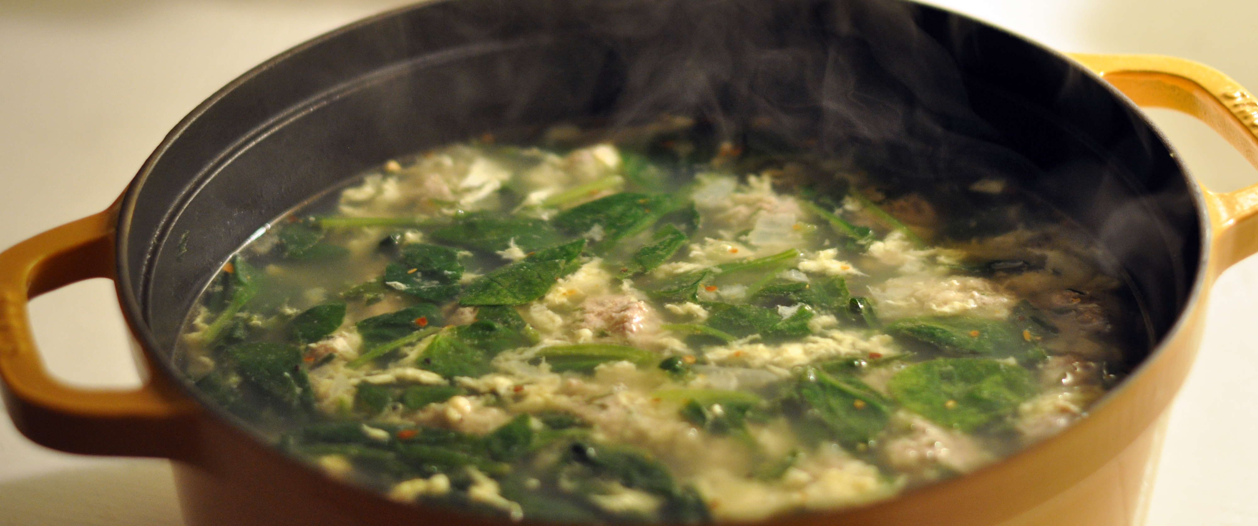T and I were recovering from a cough and cold that left us worn, so we looked to an Italian Wedding Soup to soothe our throats and bones. Rolling the little meatballs, swirling in the eggs and cheese, and finally, slurping up the hot broth was just what the doctor ordered.